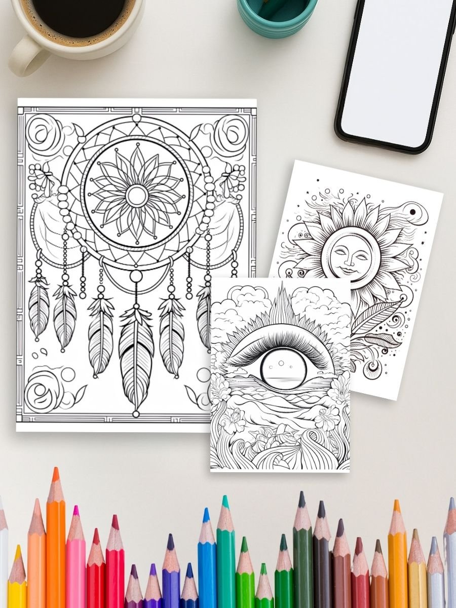 These pages combine boho themes with abstract shapes for mindful coloring expression.